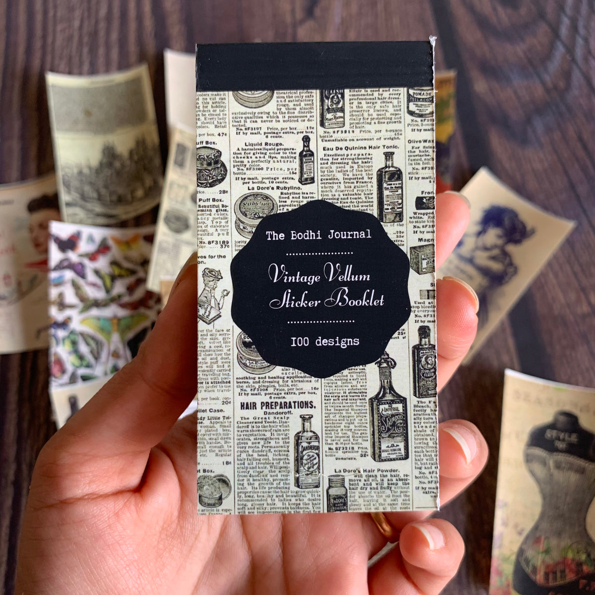 A booklet of vintage designs on vellum sticker paper, the translucent paper gives a beautiful matte finish and elevates your journal pages. The vintage designs are versatile with themes like vintage letters and postcards, advertisements, maps, collages and botanicals.